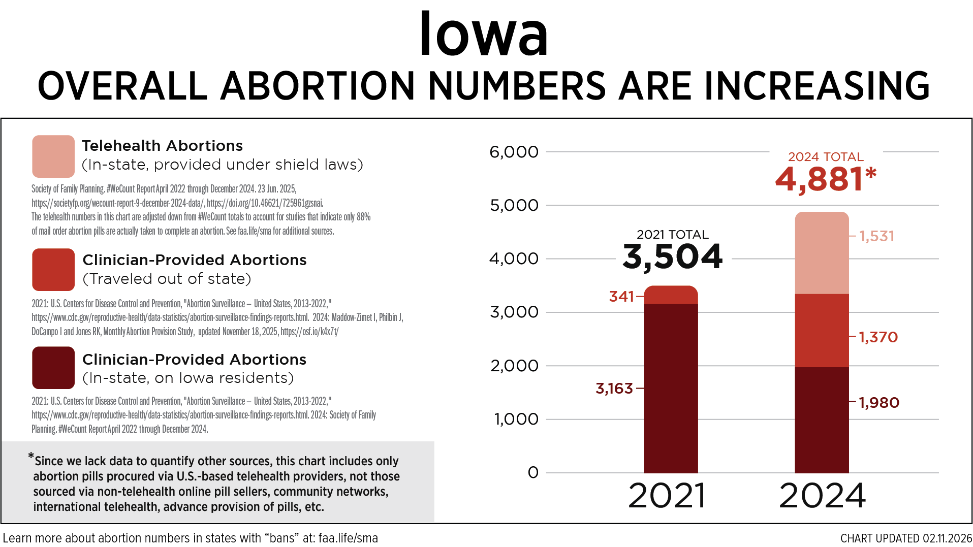 Despite the heartbeat law enacted in 2023, Iowa babies are still being aborted on a horrific scale. Based on conservative projections, over 4,881 Iowa preborn babies were legally murdered in 2024 as allowed by current law.[1] At least 1,980 were performed by clinicians in Iowa,[2] another 1,370 occurred out of state,[3] while over 1,531 Iowa mothers legally performed DIY at-home abortions using the abortion pill.[4]