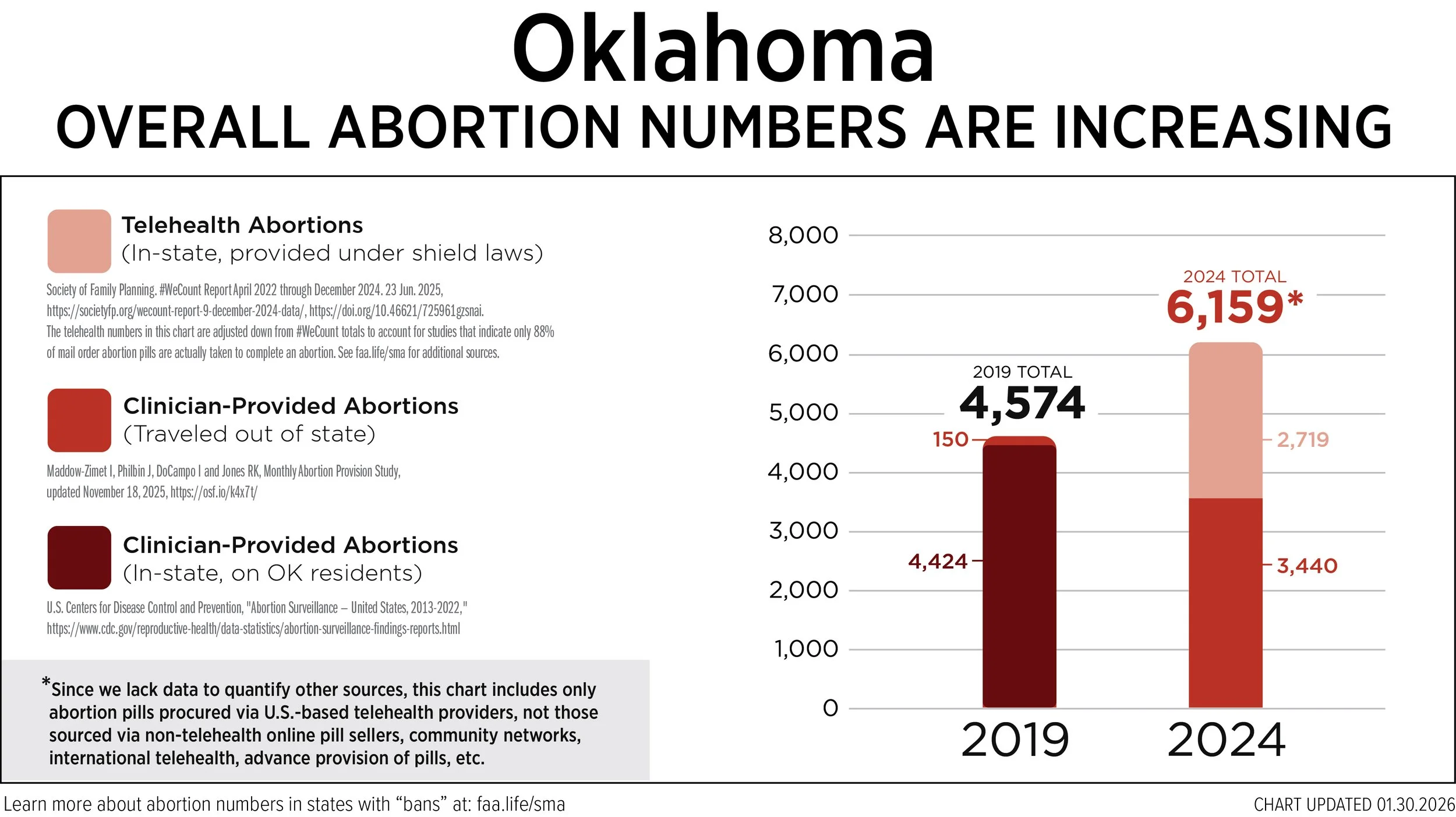 Despite the trigger law, Oklahoma babies are still being aborted on a horrific scale. Based on conservative projections, over 6,159 Oklahoma preborn babies were legally murdered in 2024 as allowed by current law.[1] Over 3,440 occurred out of state,[2] while another 2,719 Oklahoma mothers legally performed DIY at-home abortions using the abortion pill.[3]