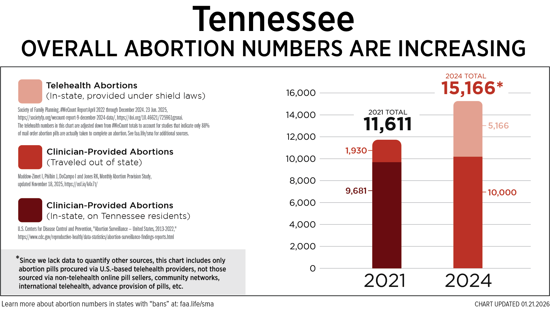 Despite the recently enacted Human Life Protection Act, Tennessee babies are still being aborted on a horrific scale. Based on conservative projections, over 15,166 Tennessee preborn babies were legally murdered in 2024 as allowed by current law.[1] At least 10,000 occurred out of state,[2] while another 5,166 Tennessee mothers legally performed DIY at-home abortions using the abortion pill.[3]